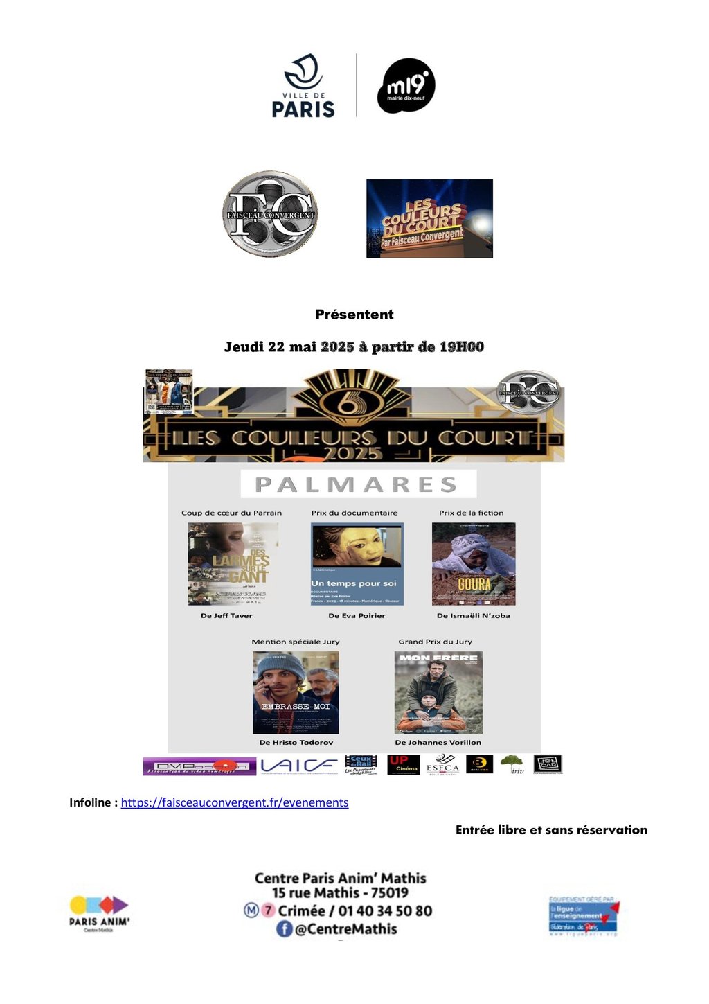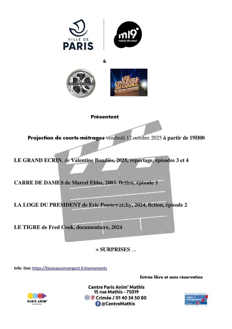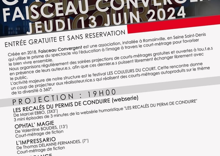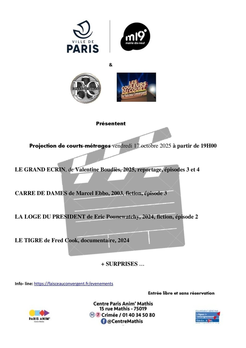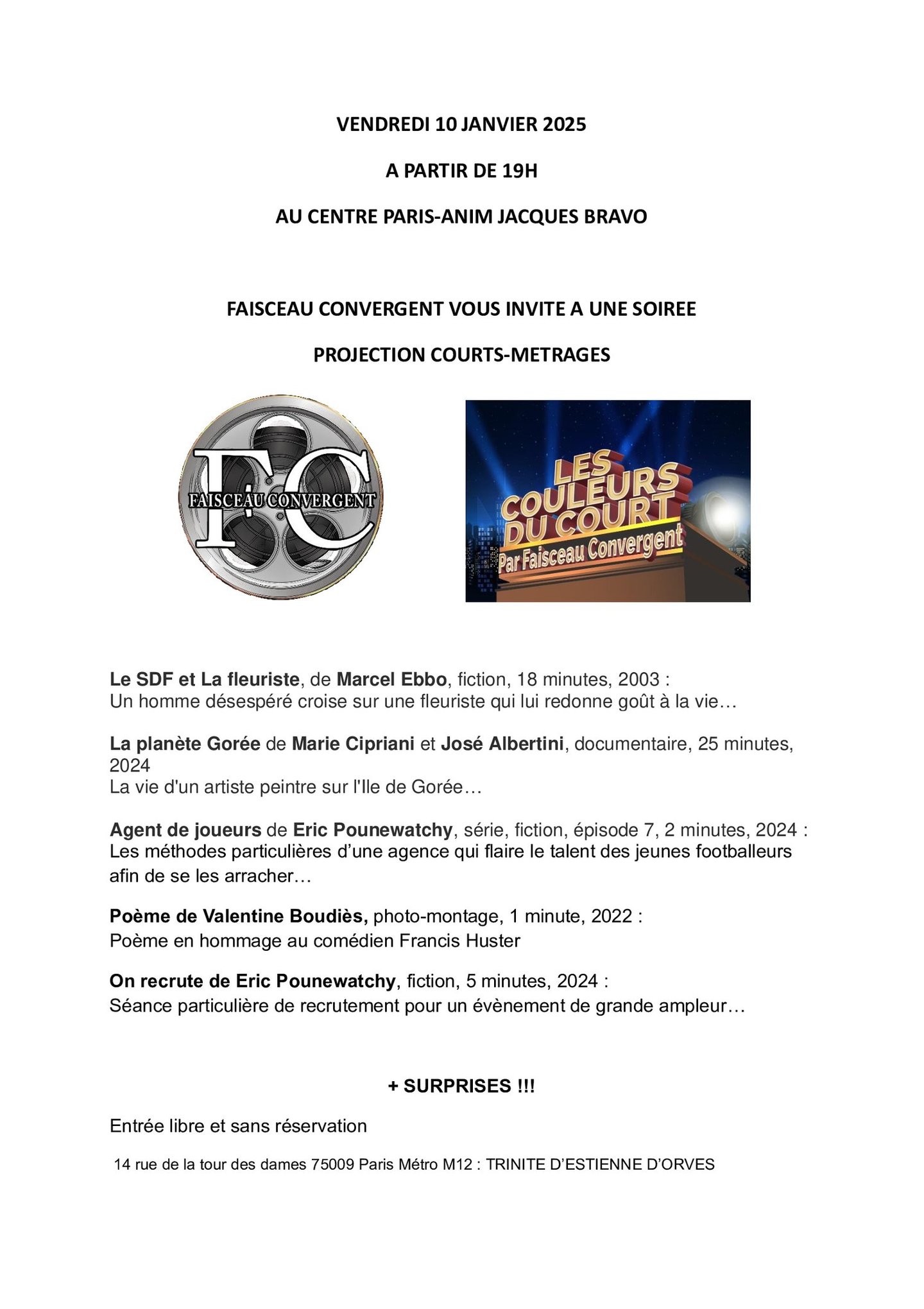 Le centre Paris Anim Victoire Tinayre reçoit Faisceau Convergent pour une soirée courts-métrages en présence des réalisateurs avec beaucoup de surprises sur scène, gratuit et sans réservation. Nous vous attendons nombreux pour partager ce moment en toute convivialité ...