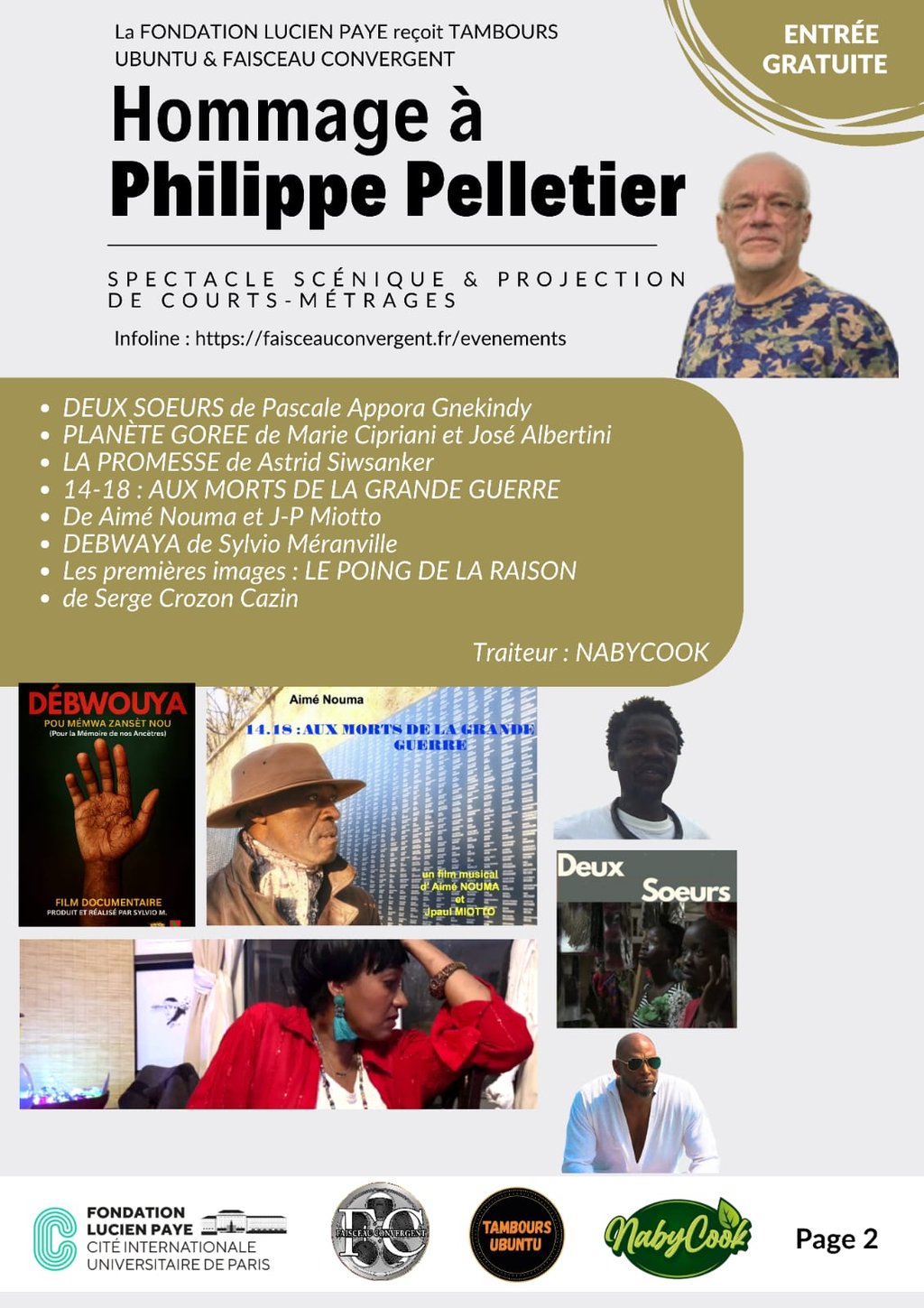 A l'occasion de la disparition de Philippe PELLETIER, amoureux inconditionnel du cinéma africain pour lequel il a contribué à promouvoir tout au long de sa vie en donnant un coup de projecteur aux jeunes talents du Continent Mère, LA FONDATION LUCIEN PAYE accueille FAISCEAU CONVERGENT & TAMBOURS UBUNTU pour lui rendre un dernier hommage