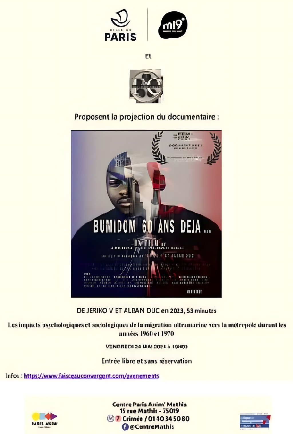 Entrée gratuite et sans réservation, le centre Paris Anim-Mathis, accueille l'association Faisceau Convergent pour la projection de BUMIDOM, 60 ANS DEJA de Jeriko V et Alban Duc.