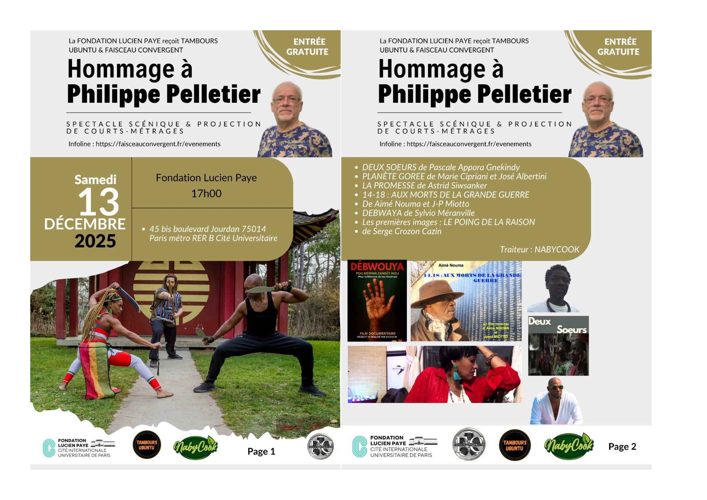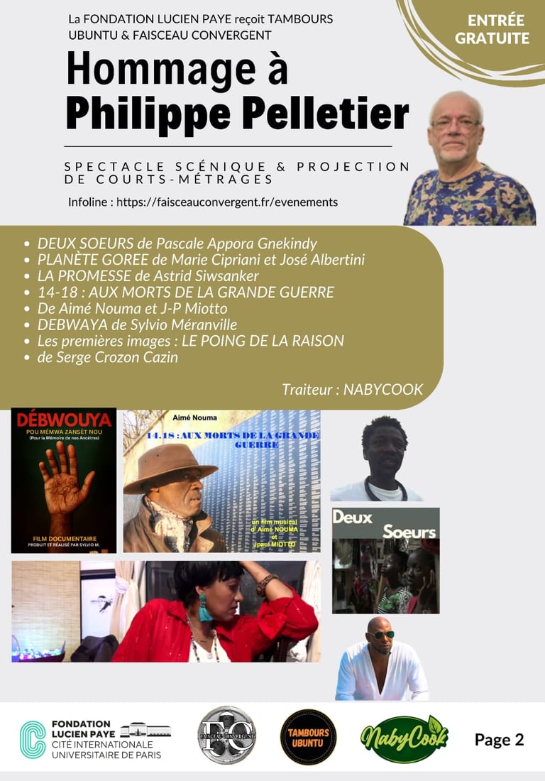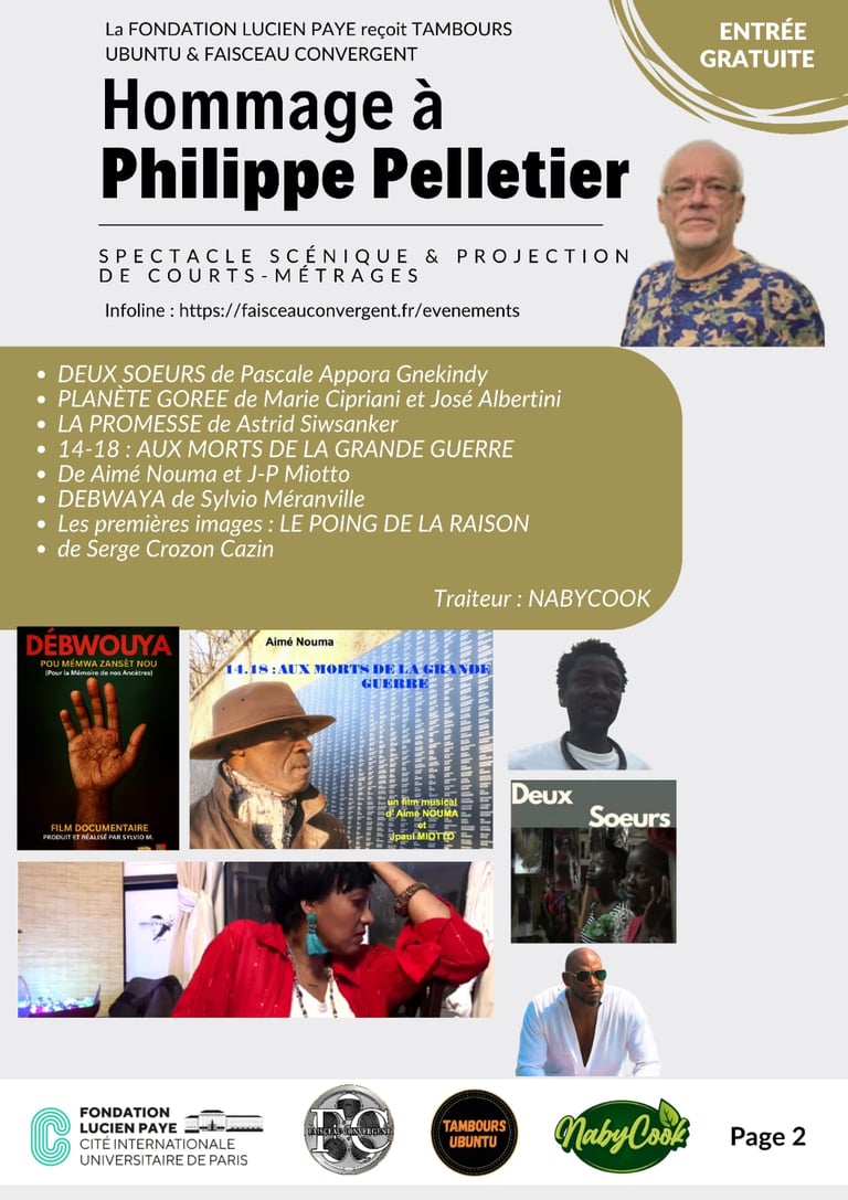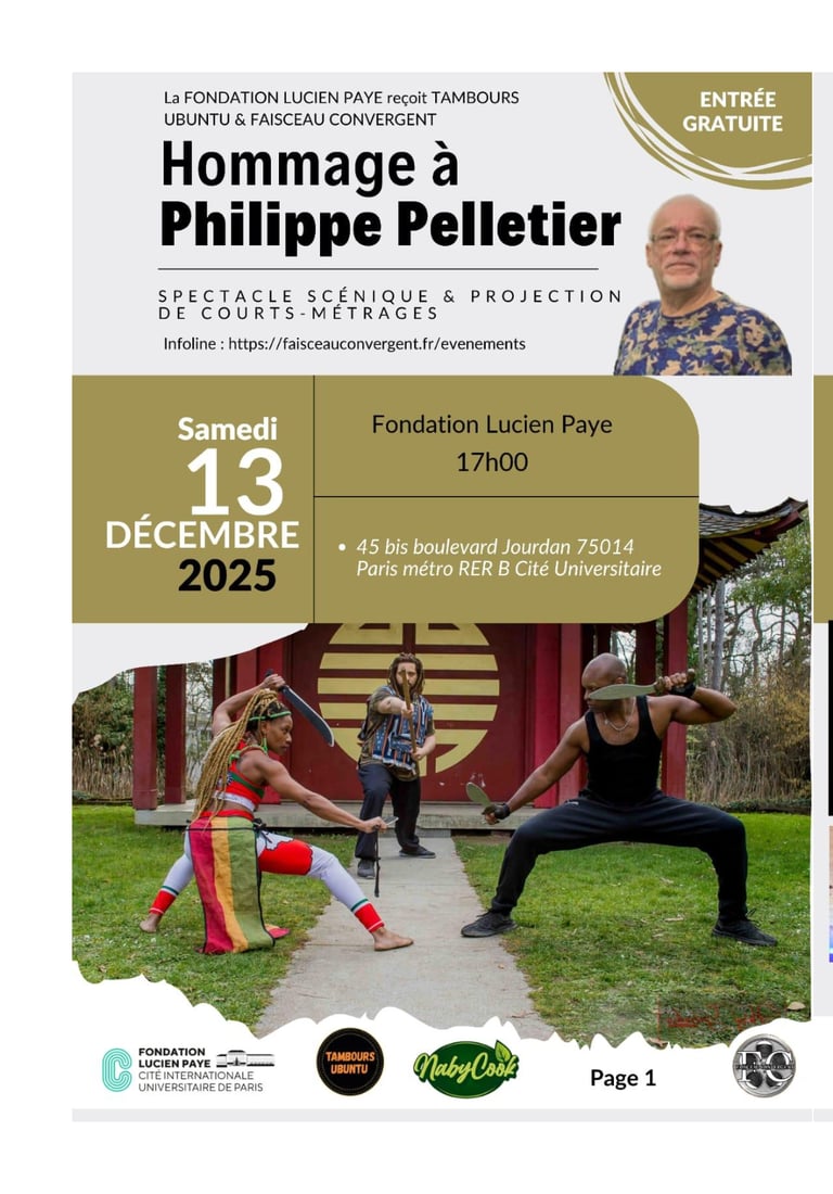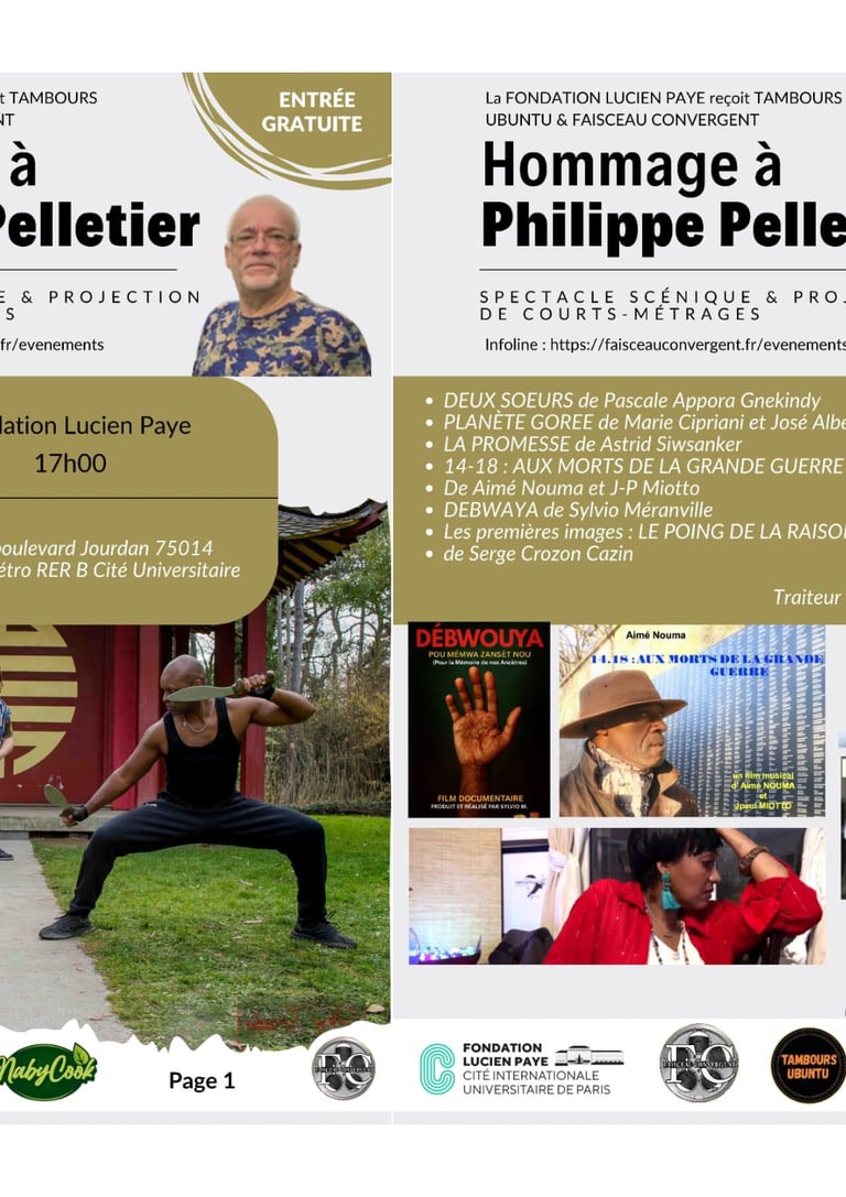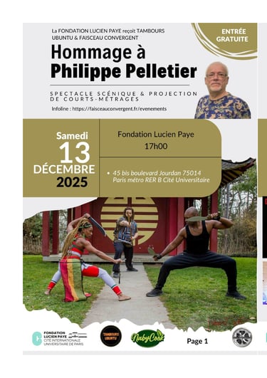 A l'occasion de la disparition subite de Philippe Pelletier, amoureux inconditionnel du cinéma africain qui a su donner un coup de projecteur aux jeunes réalisateurs du Continent Mère de son vivant, la Fondation Lucien Paye au sein même de la cité internationale de Paris ( à côté de la Maison de la Tunisie ), accueille FAISCEAU CONVERGENT & TAMBOURS UBUNTU pour lui rendre un dernier hommage