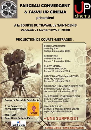 La Bourse du Travail de Saint-Denis reçoit les associations FAISCEAU CONVERGENT & TASVU UP CINEMA pour une nouvelle soirée projection de courts-métrages, au cours de laquelle vous découvrirez des oeuvres filmées courtes à travers les différents regards des univers particuliers des réalisateurs en leur présence avec qui vous pourrez librement échanger en toute convivialité.
